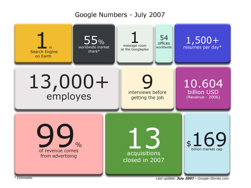 这篇文章以一张图片为主。没有其它重要的东西。图片是关于Google的一些数据,例如市场总值,广告收入,员工总数等等。不能不感叹Google的成功。