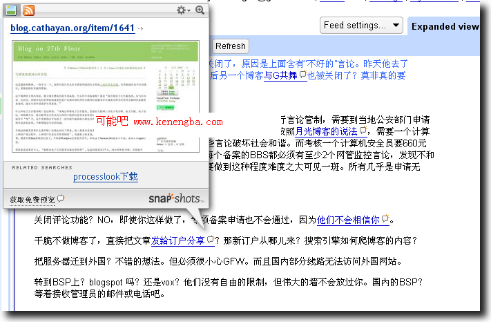 如果你是使用Google Reader进行订阅阅读的,可以告诉你一个好消息,Snap Shots浏览器插件对Google Reader完美支持,文章中的超链接都具有预览功能。阅读时不希望打开新窗口可以使用这样的方式粗略预览链接。下面是截图: