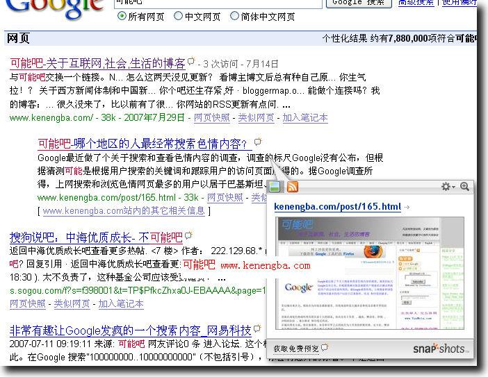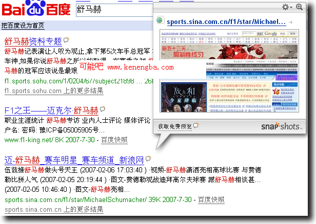 进入正题,如果你是喜欢snap那样的搜索方式,这个插件一定很适合你。它可以让你的google ,yahoo, live search, 百度等的搜索结果每一项都具有图片预览,只需要把鼠标轻轻放在链接旁边的小气泡上面。看看截图: