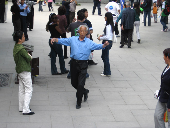 人还是和故宫那边那么多,人多了,显得这个门楼不那么庄严了。 无意中拍到一个上了年纪的人在跳舞,别有一番风味。