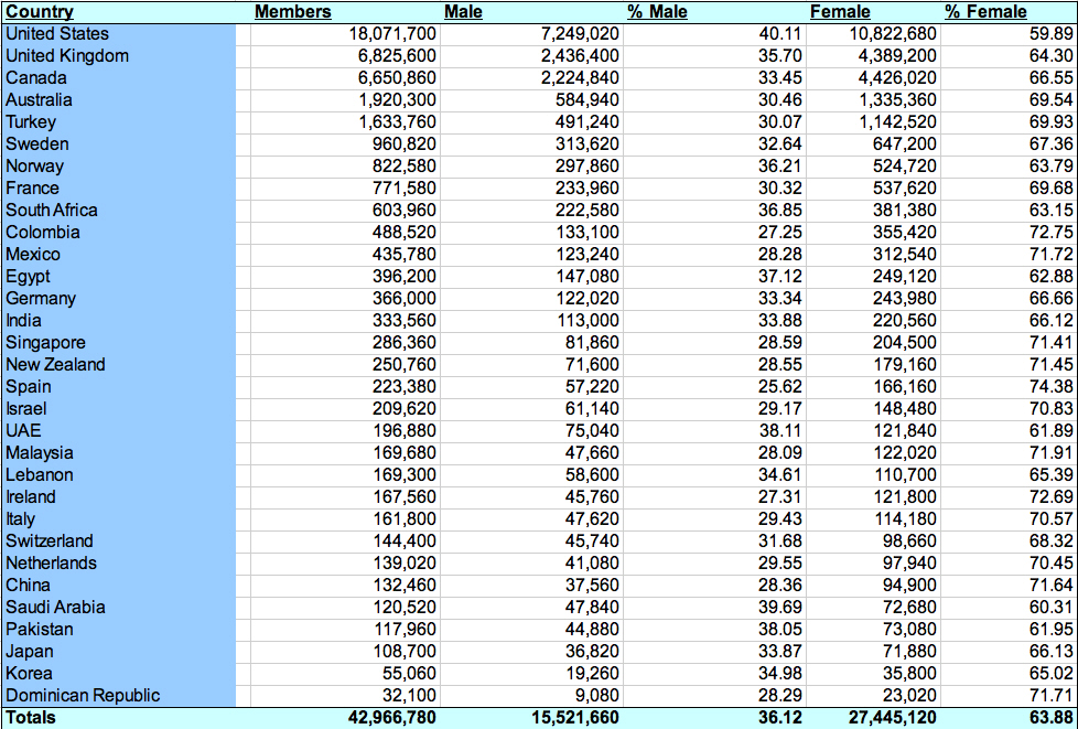 我一直以为,不管是什么交友网站、什么社会网络网站(例如校内网),都是男性用户居多的。但前几天从TechCrunch里看到的数据着实使我惊讶了一番。在Facebook里,女性用户占到了2/3。当然,这里面肯定存在一些水分,例如一人多帐号,虚假性别,注册后走人等等。在原文下面的讨论中,也有人说从自己的Facebook广告客户帐户里查出的数据和这份数据有所不同。