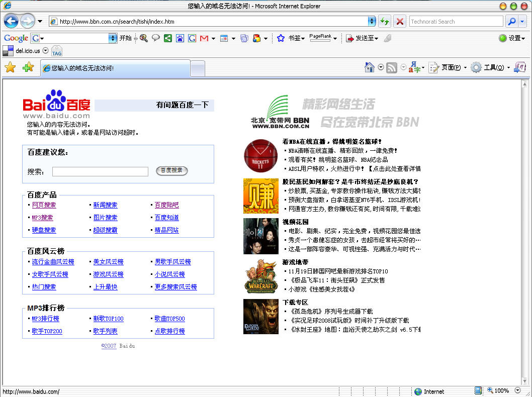 在GoogleReader里点击了一个链接,打开后竟然是“您输入的内容无法访问。有可能是输入错误,或者是网站访问超时。”这样的提示,这个提示页面从地址bbn.com.cn上来看是属于北京宽带网的。我使用的线路是河北网通,难道是河北网通开始耍流氓了?如果是,为何耍到北京宽带网,而不是河北宽带网(如果有的话)?